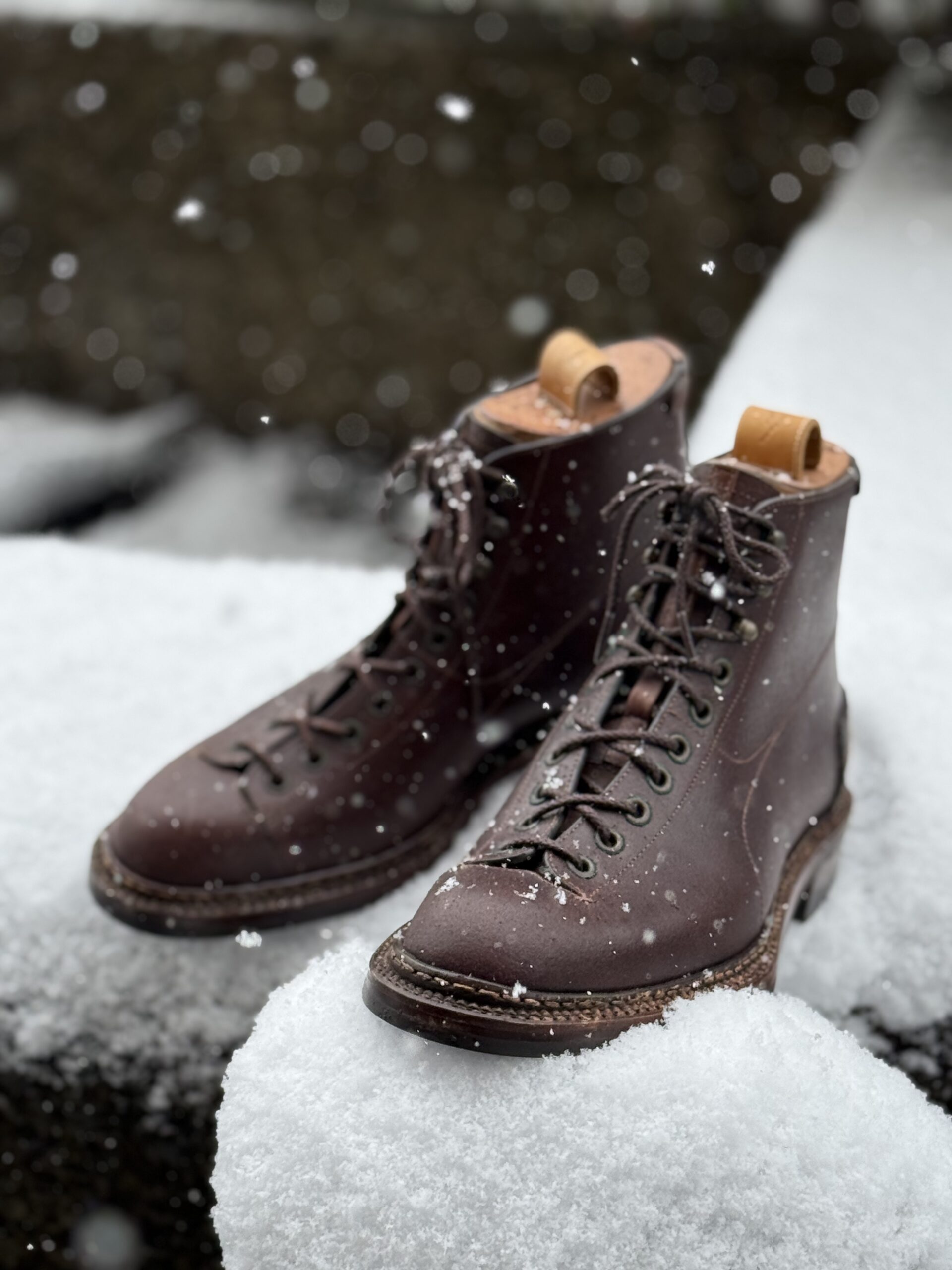 2月7日の夜から降り続いた雪は、明日にはバルコニーを真っ白にしてくれました。ちょっと思いつきでラバーソールのノルウィージャン”MagicMonky”で記念写真。ミャンマー登山をクリアした強者です。