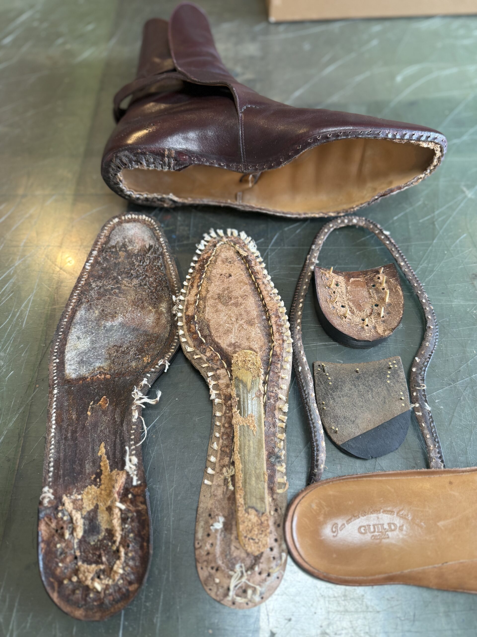 ヒール、アウトソールから始まり、ウェルトを解きインソールも外しました。17年の年月をもってインソールには大きなダメージはありませんでしたが、今回はアッパーの大きなダメージを修復するために取り外しました。どういうわけか、多くのジョッパーブーツファンはヘビーユーザーが多いですが、彼らは皆ブーツを愛しています。